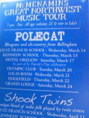 December 2011 was our first show in Portland and also our first trip to Idaho. We also teamed up with the Polyrhythmics early in the month for a fun show at Nectar in Seattle. New Year's Eve was spent with Acorn Project at the Wild Buffalo which was just as awesome as we expected it to be! We all went 70's for the Dazed and Confused theme, and even got a little Fleetwood Mac in there. ![]() Then we went down to Portland again for two shows at the Goodfoot; one with Sugarcane and one with the Giraffe Dodgers. Another favorite that month was the Old Foundry show in Bellingham with bluegrass rippers Northern Departure and local band Dennis. The Old Foundry folks gave us the primo treatment as usual :) ![]() Sugarcane then came up to Bellingham and joined us for our headlining show at the Wild Buffalo on March 2nd. Here is a video taken from March 2nd at the Wild Buffalo! ![]() This was followed by Guemes Island's Woodchopper's Ball and another Idaho run. And THEN! The loveliest tour of our lives! McMenamins put us up on their Great Northwest Music Tour in March, a string of 7 dates at McMenamins venues throughout Washington and Oregon. We met so many great new people, played in so many awesome rooms (including Lola's Room at the Crystal Ballroom in Portland), and felt like well fed rockstars. ![]() Our first headlining show in Seattle was at the High Dive on March 23rd with Head for the Hill and the Warren G. Hardings. It was packed and a huge success. Thanks! Jonathan sat in with us on a tune playing trumpet and he took tons of great pictures: Check out pictures from March 23rd at the High Dive taken by Jonathan Gipaya! Then over to the San Juan Islands for Rumor Mill and the Galley. Spokane and Missoula were the next weekend. That's where I took this lovely shot: ![]() We almost got a great band photo out of this! In mid April we drove down to California for a four night run in Sacramento, Eureka, Sebastopol, and San Francisco. What a hoot! We played two nights with Lonesome Locomotive who were great to play with. We also got to meet the folks from Dead Winter Carpenters in San Fran :) Speaking of almost band photos.... ![]() Can you tell who is documenting these moments? During the run we also got to visit our favorite family fun center where Karl won our new dashboard mascot W.T.! He is now a permanent fixture in our beloved Michael Bolton. ![]() Then we had a hell yeah show at the Tractor in Seattle with Per Near Sandstone! An impressive count for a Thursday night. Jonathan rode with us and played on a couple of tunes as well as taking more great photos. Thanks also to Jason for sitting in with us! Check out Jonathan's photos from the Tractor here! ![]() The next night we played at Worthy Fest out in Glacier with Snug Harbor, the Endorphins, and Acorn Project among others. I can't believe it didn't rain! Karl made himself known to the crowd :) ![]() Have you seen our video from the van? Check out how musical the boys can be when they really try! Polecat Van Jam During this time we also released the next video from our series filmed at the Roost: Turnbull Reel Check out what's coming up on the calendar and stay posted for new summer dates! You won't be disappointed :) Leave Comment: |